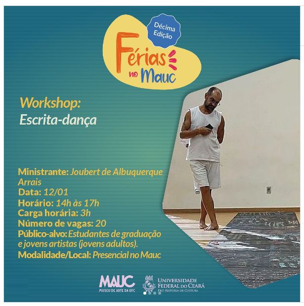 Como parte da décima edição do “Férias no Mauc”, realizado pelo Museu de Arte da Universidade Federal do Ceará (Mauc/UFC), vai ocorrer nesta sexta-feira, 12 de janeiro de 2024, das 14h às 17h, o Workshop “Escrita-Dança”. Ministrado pelo professor Joubert de Albuquerque Arrais, da Universidade Federal do Cariri (UFCA), esse workshop é resultado da pesquisa de pós-doutorado desenvolvida por ele e intitulada “Comunicação, dança, literatura e criação contemporânea: estudos para dançarinar”.