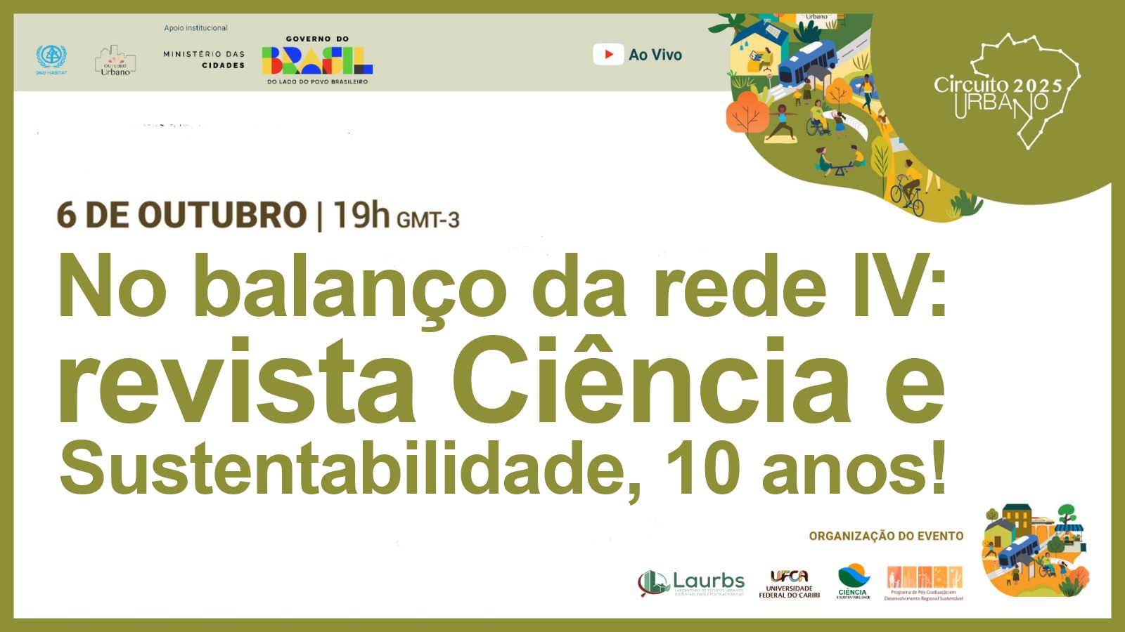 No dia 6 de outubro de 2025, a Universidade Federal do Cariri (UFCA), por meio do Laboratório de Estudos Urbanos, Sustentabilidade e Políticas Públicas (Laurbs/UFCA), vai realizar o evento “No balanço da rede 4: Revista de Ciência e Sustentabilidade – 10 anos”.