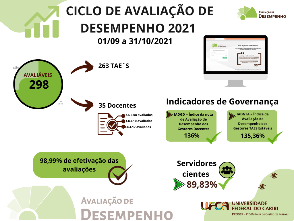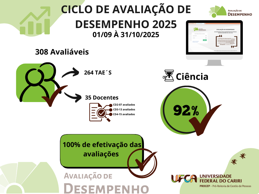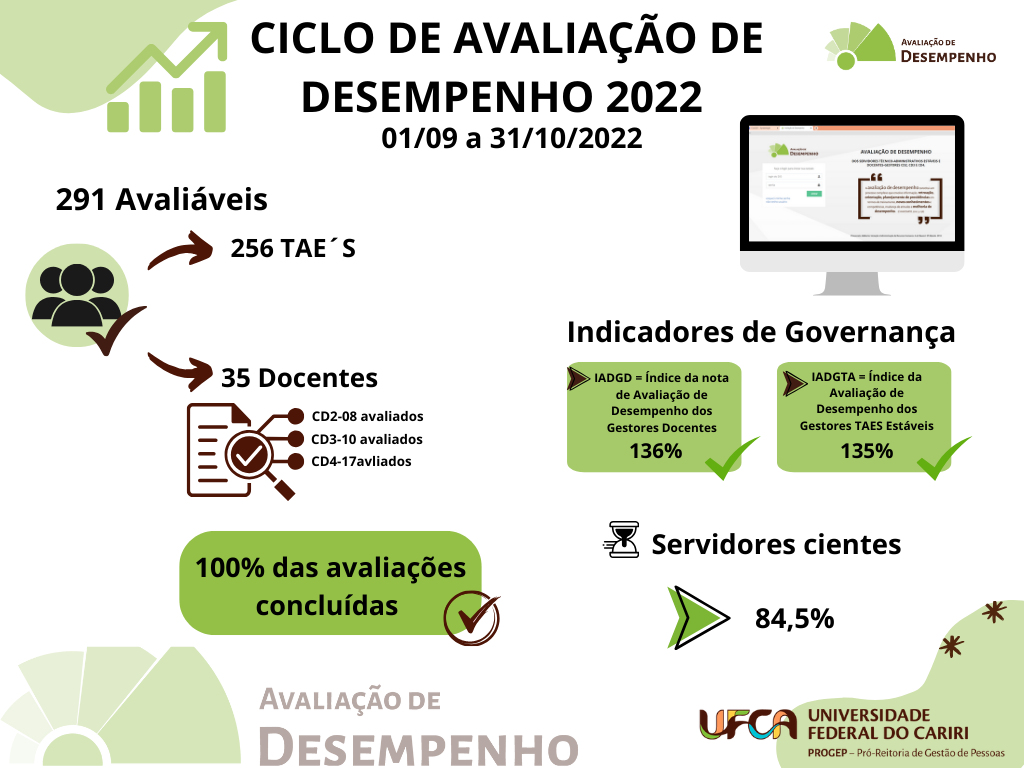 A avaliação é um processo de acompanhamento contínuo do desempenho do servidor em seu cargo e/ou função, assim como do seu potencial de desenvolvimento no trabalho. Atualmente na Universidade Federal do Cariri- UFCA existem 2 tipos de avaliação para os servidores Técnico-Administrativo em Educação – TAE.